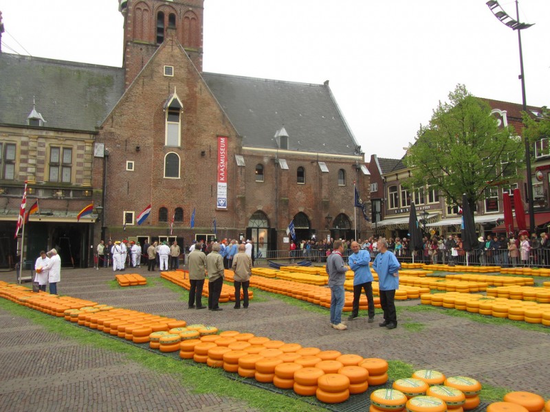 A l'arrière-plan vous pouvez voir le bâtiment de la Waaggebouw, une ancienne chapelle du XIVe siècle, qui abrite aujourd'hui le Kaasmuseum Hollandse, un musée expliquant les techniques de fabrication des fromages locaux.