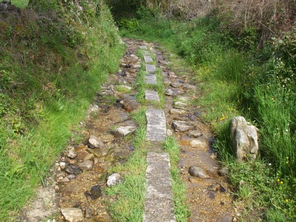 Etape en Espagne : CAMINO PASSAGE DU RUISSEAU PAR UNE CORREDOIRAS |