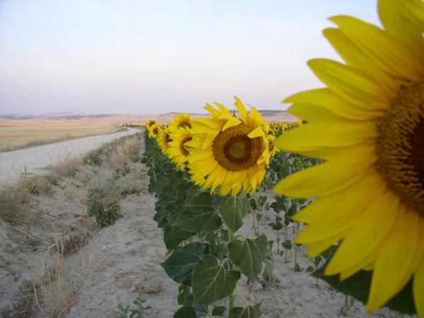 Après une lente ascension qui nous fait quitter Castrojeriz des yeux, se présente une grande descente et ces merveilleux champs de tournesols...