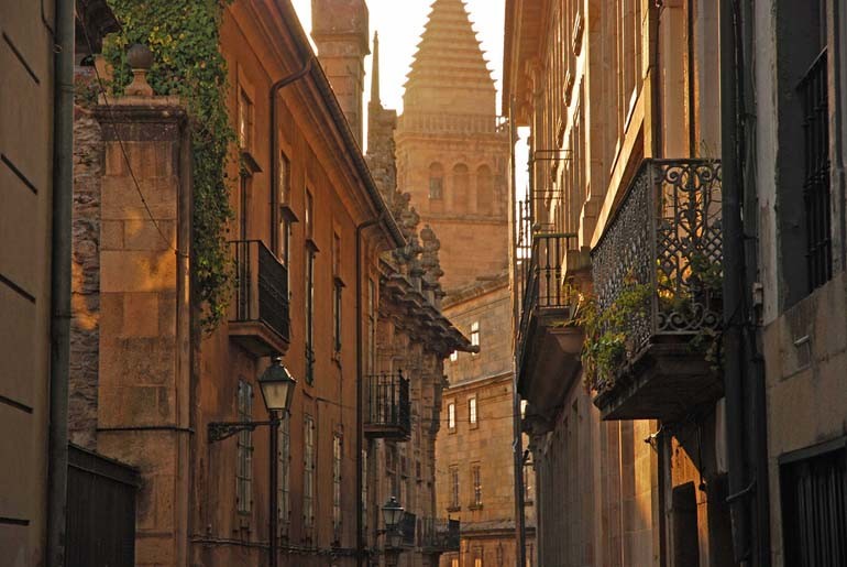 La photo du jour présente une vue d'une rue de Saint Jacques de Compostelle au petit matin avec une belle luminosité