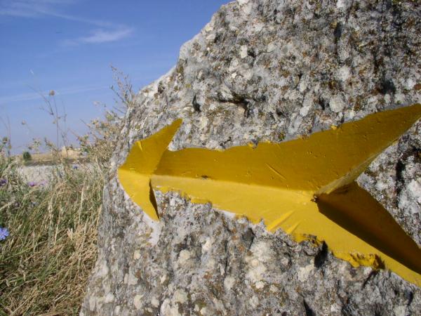 Une des bornes indiquant la route à suivre. Contrairemnt à ce qu'on voit, la flèche est creusée et pas en relief.