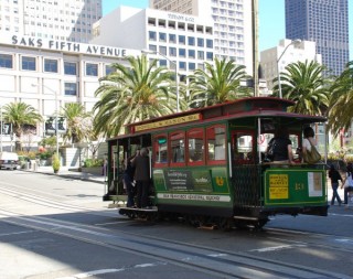 Le tramway de San Francisco. A l'arrière-plan, le building Saks Fifth Avenue domine l'angle nord-ouest d'Union Square