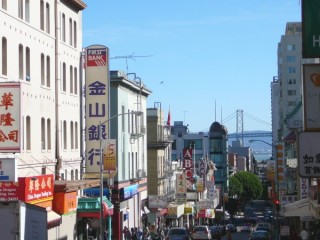 Nous quittons maintenant le quartier chinois... Au loin sur cette photo, on aperçoit le Golden Gate Bridge, l'icône de San Francisco.