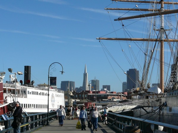 Promenade sur le quai. A l'arrière plan domine la transamerica pyramid.