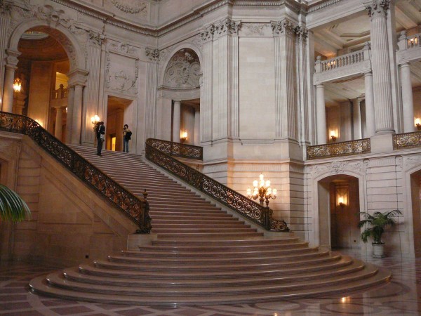 L'intérieur du City Hall est fastueux : escalier monumental, colonnes exubérantes, sols de marbre rose du Tennesesee...