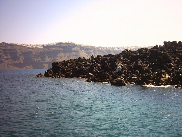 Vue de puis le bateau: le volcan en avant-plan, Fira derrière.