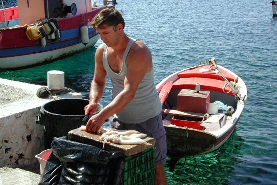 Vie quotidienne à Santorin : Ammoudi - Le découpage des calamars |
