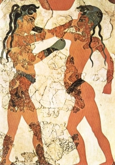 Sur la fresque des boxeurs, deux adolescents vêtus d'une ceinture retenant un pagne se mesurent dans un combat. Celui de gauche porte colliers et bracelets, l'autre est sans bijoux. Observez bien les coiffures. De même que pour la fresque du pêcheur, une question se pose : les crânes étaient-ils rasés ne laissant que des mèches ou bien les boxeurs portaient-ils des calottes en tissu avec des ouvertures pour laisser passer des mèches ?