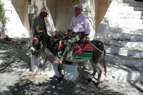 Vie quotidienne à Santorin : Pyrgos - Un vieux paysan sur son âne |