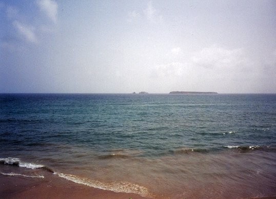 Vue sur l'océan atlantique depuis la plage de la Madeleine. On distingue plusieurs iles au large :