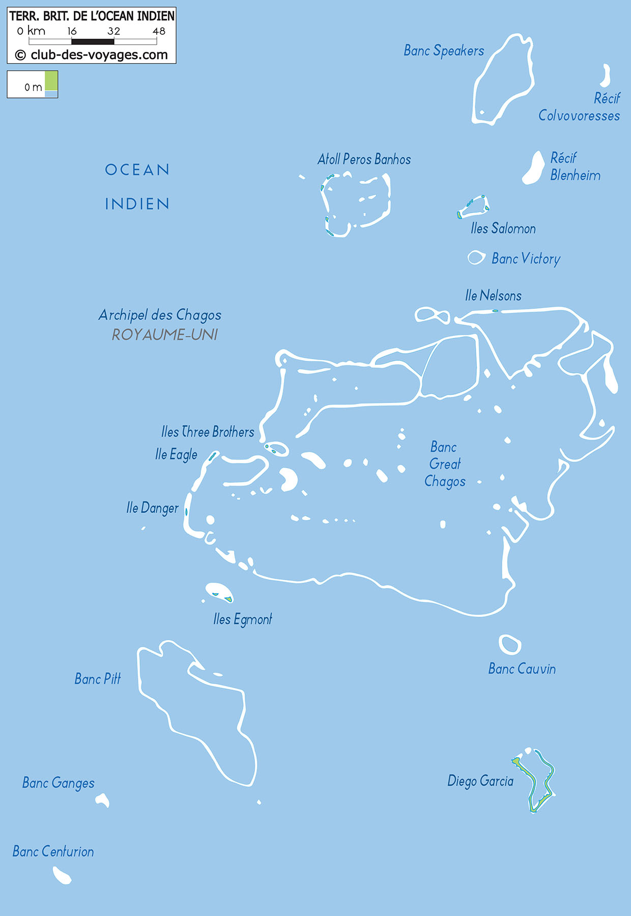 Nos différentes cartes des Territoires britanniques de l'Océan Indien à explorer: carte physique, carte routière, vue satellite. Pour tout savoir sur la géographie des Territoires britanniques de l'Océan Indien.
