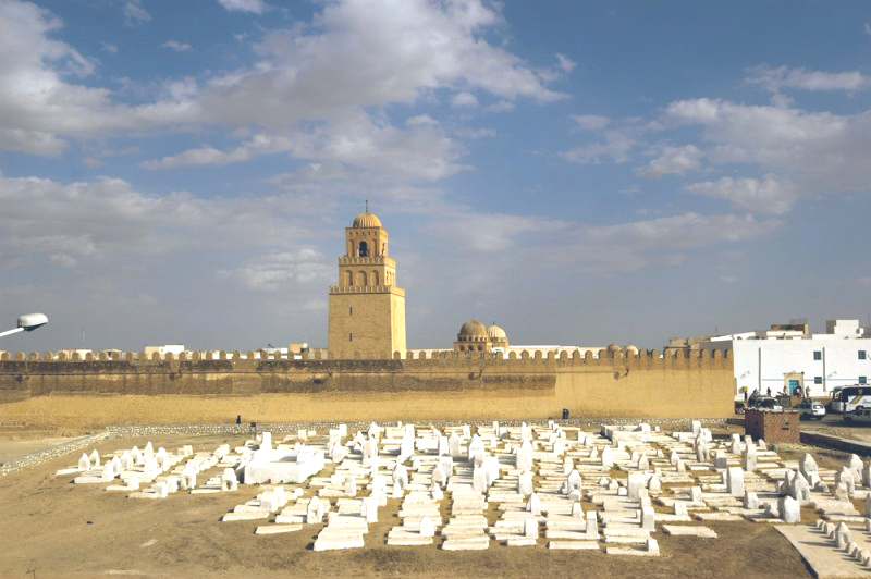 La mosquée Sidi Okba de Kairouan fut construite en 680, à l'aube de l'Islam. C'est la plus ancienne mosquée d'Afrique. Au premier plan se trouve le cimetière musulman.