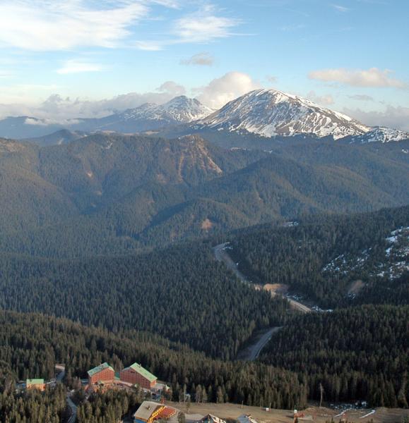 Paysage magnifique de la foret recouvrant la chaine de montagne ILgaz daglari avec en haut à droite Buyuk hacet Tepesi point culminant de la province de Kastamonu et en bas de l'image les instalations höteliéres de la station de Ski locale.