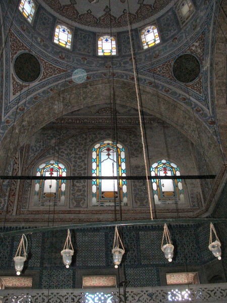 Les murs et les plafonds sont ornés de motifs entrelacés dont la couleur dominante est le bleu.