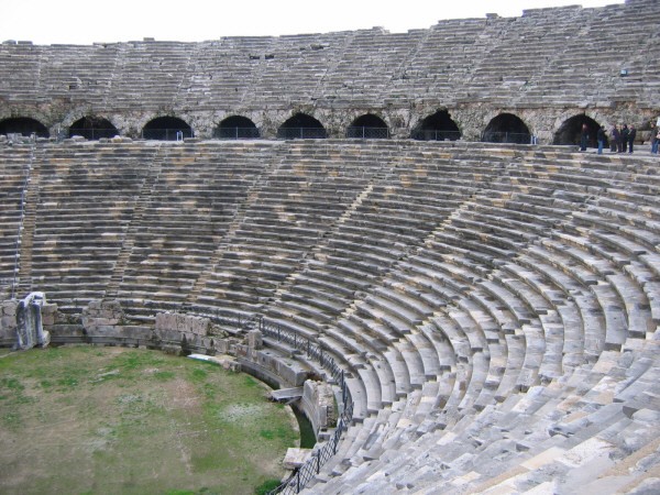 Avec ses 15.000 places, le théâtre de Side est l'un des plus vaste d'Anatolie. Il fut construit à l'époque hellénistique puis aggrandit par les romains. Il accueille de nos jours diverses manifestations.