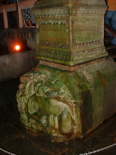 La Gorgone, ou Méduse, est une figure emblématique de la mythologie grecque. Deux colonnes de la citerne basilique repose sur des piédestaux à tête de Méduse. Celles-ci ont la tête renversée. On en ignore la raison.