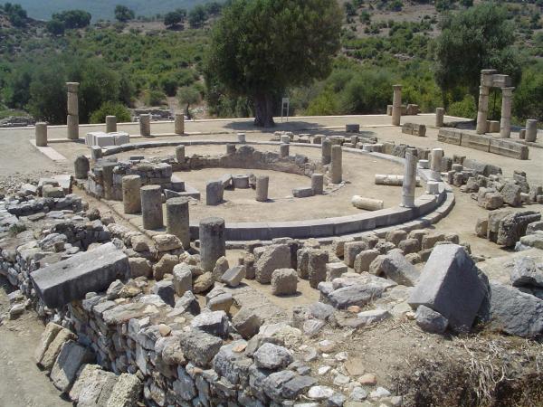 Sur une terrase donnant sur le port se trouvent de nombreux vestiges comme ce temple en forme de demi-lune que l'on suppose dédié à Zeus Soteros. Sa période construction est estimée au Ier siècle avt JC.